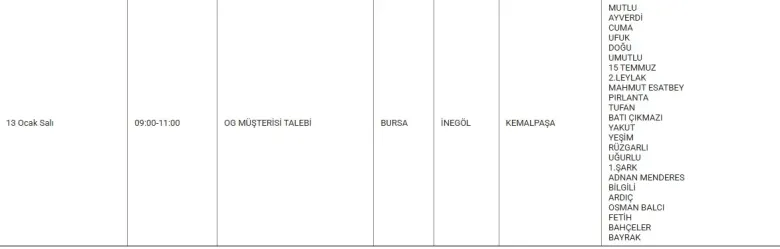 Aynı gün akşam saatlerinde, 19.00–21.00 arasında Osmaniye Mahallesi’nde yine OG müşteri talebi doğrultusunda planlı kesinti uygulanacağı bildirildi.