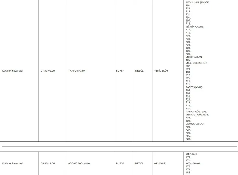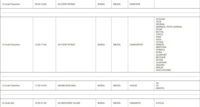 İnegöl'de 12 ve 13 Ocak tarihlerinde planlı elektrik kesintileri uygulanacak. Orta gerilim (OG) bakım, fiziki irtibat ve abone bağlama çalışmaları nedeniyle yapılacak kesintiler, ilçe genelinde birçok mahalleyi kapsıyor.