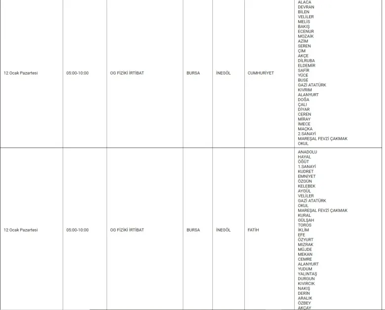 Aynı gün 05.00–10.00 saatleri arasında OG fiziki irtibat çalışmaları kapsamında Cumhuriyet, Fatih ve Esentepe mahallelerinde elektrik kesintisi yaşanacak. Bu saatler arasında çok sayıda sokak ve yerleşim alanında enerji verilemeyecek.