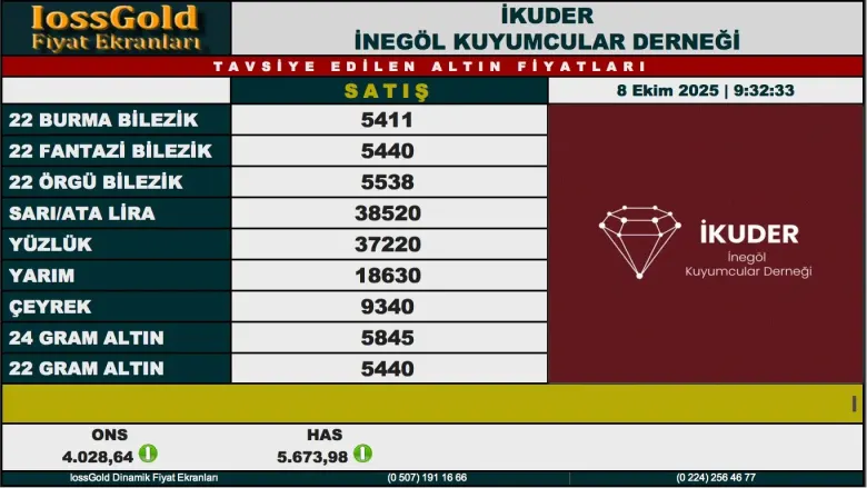 8 Ekim 2025 itibarıyla İnegöl Kapalı Çarşı’da altın fiyatları şu şekilde: