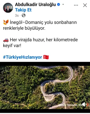 Bakan Uraloğlu, paylaşımında İnegöl–Domaniç yolunun drone görüntülerine yer verdi. Turuncu, sarı ve yeşilin tonlarının iç içe geçtiği yol manzarası kısa sürede binlerce beğeni aldı.