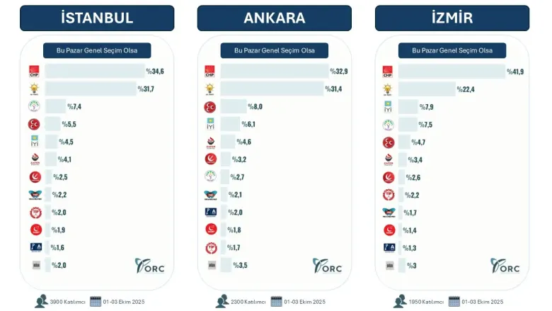 ORC Araştırma, 1–3 Ekim 2025 tarihleri arasında Türkiye’nin üç büyük ili olan İstanbul, Ankara ve İzmir’de seçmenlerin nabzını tuttu.