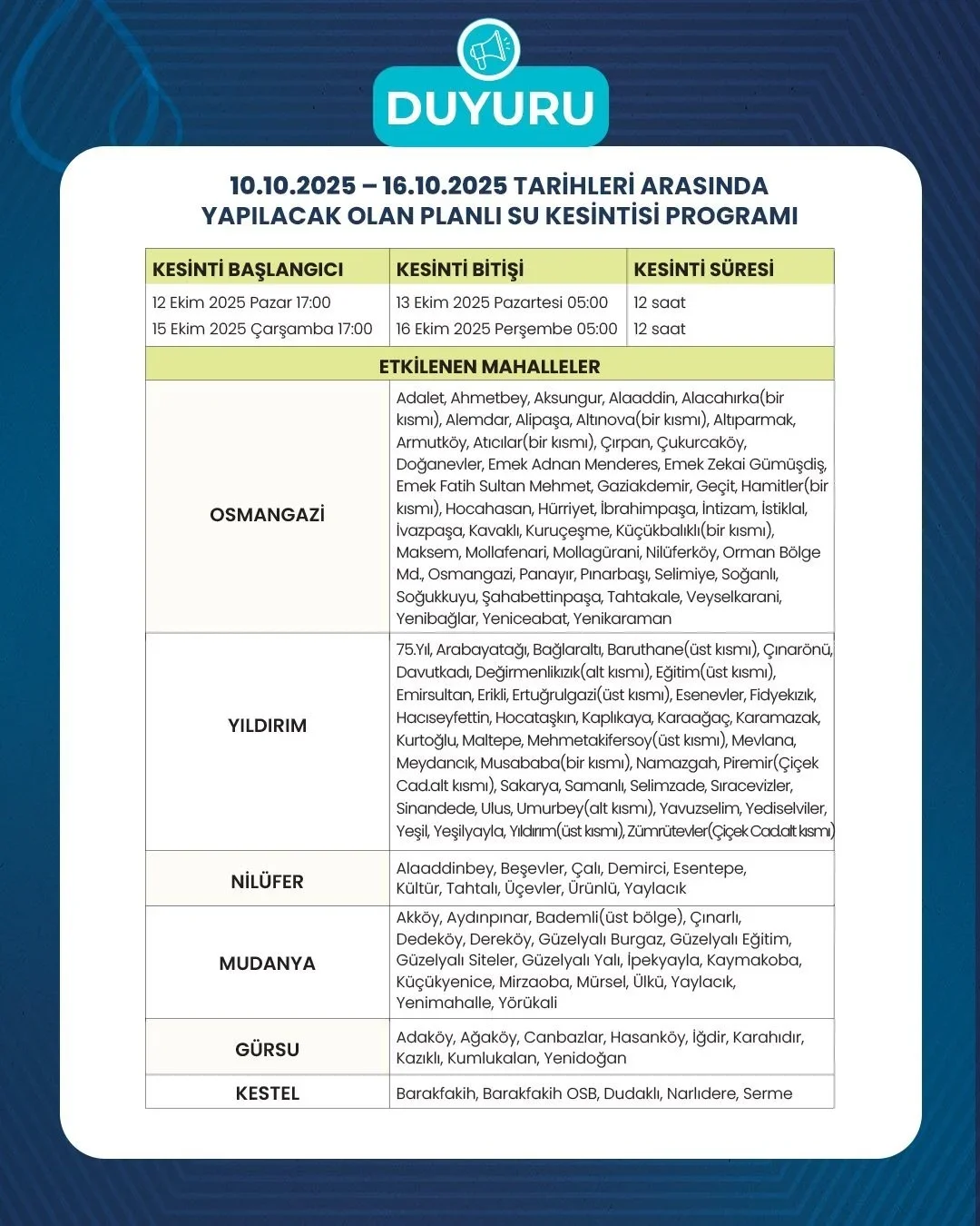 Yapılan açıklamaya göre, merkez ilçelere bağlı mahallelerde dönüşümlü su kesintileri günlük 12 saati aşmayacak şekilde gerçekleştirilecek. Amacı ise 100 bin metreküp su tasarrufu sağlamak. Planlı kesintilerden Uludağ Üniversitesi, Şehir Hastanesi ve Devlet Hastaneleri etkilenmeyecek.