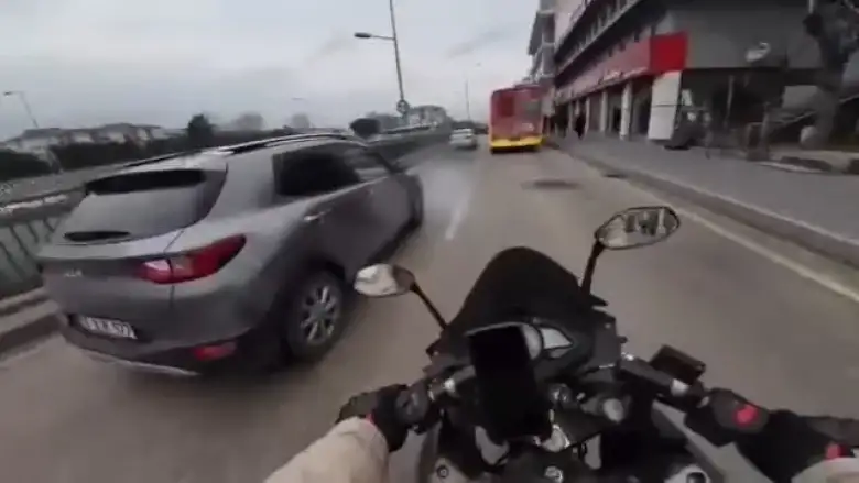 Olay, merkez Yıldırım ilçesi Ankara yolu üzerinde meydana geldi. Biranda hızlanan motosiklet sürücüsü, otobüse çarpmamak için solundan giden otomobilin önüne geçtiği an direksiyon hakimiyetini kaybetti. Sağa ve sola doğru yalpalayan motosiklet, sürücüsü kısa bir süre sonra direksiyonu toplamasıyla yoluna devam etti. Yaşanan korku dolu anlar, motosikletlinin kask kamerasına yansıdı.