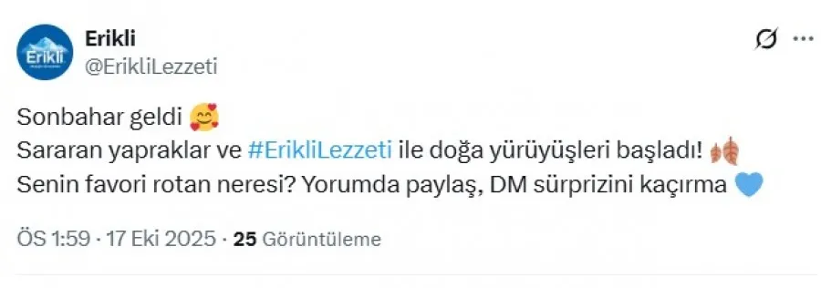Kestel ve İnegöl’de dolum tesisleri bulunan Erikli, X (Twitter) hesabından “Sonbahar geldi, Sararan yapraklar ve #ErikliLezzeti ile doğa yürüyüşleri başladı! Senin favori rotan neresi? Yorumda paylaş, DM sürprizini kaçırma” ifadeleriyle bir gönderi paylaştı.