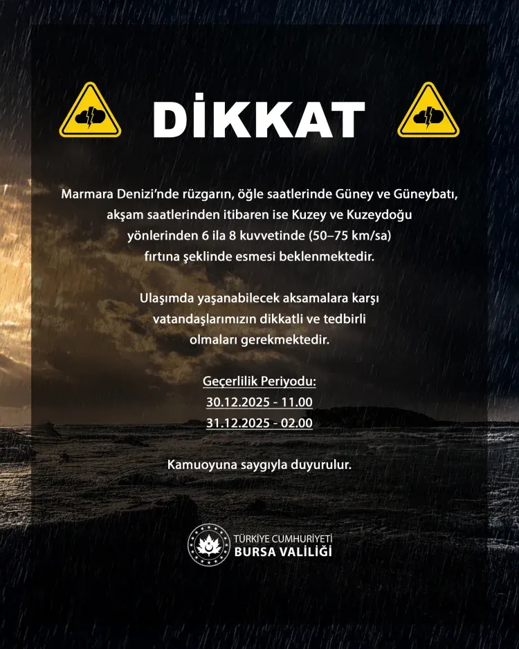 Bursa Valiliği, Marmara Denizi'nde etkili olması beklenen kuvvetli rüzgâr ve fırtınaya ilişkin yazılı bir açıklama yaptı. Açıklamada, bölgede deniz üzerinde rüzgâr hızının artacağı ve kısa süreli fırtına koşullarının görüleceği bildirildi.