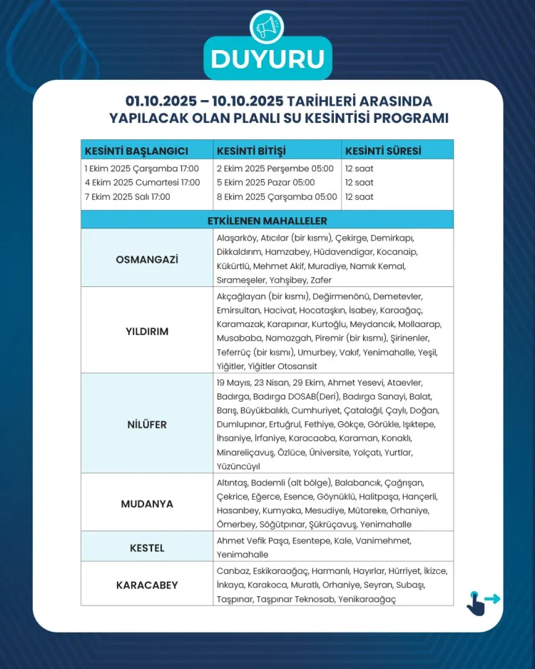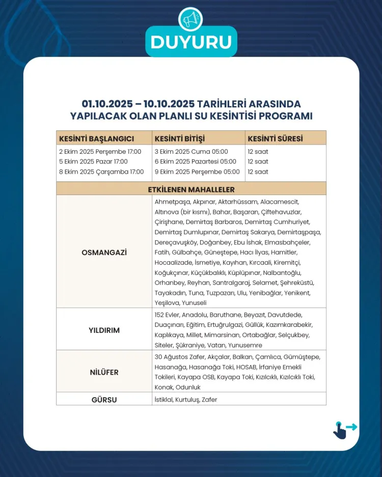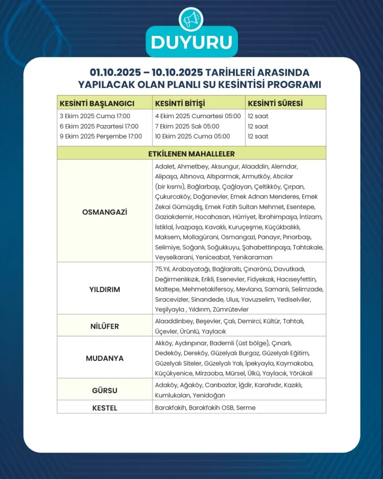 İdare tarafından sağlanan içme suyunun kalitesi 24 saat izlenmekte olup güvenli tüketim sağlanmaktadır. Planlı su kesintilerinden Uludağ Üniversitesi, Şehir Hastanesi ve Devlet Hastaneleri etkilenmeyecek. Detaylar için ekteki su kesinti listesine başvurulabilir.