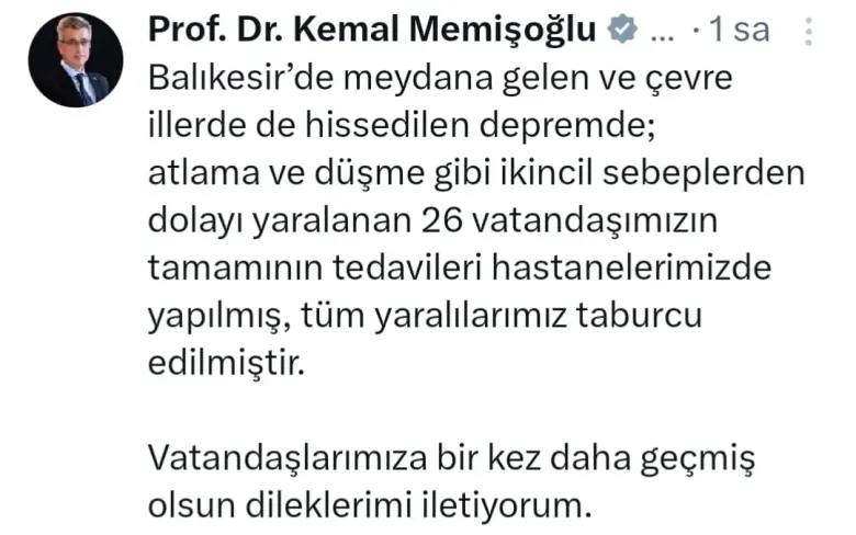 “Balıkesir’de meydana gelen ve çevre illerde de hissedilen depremde; atlama ve düşme gibi ikincil sebeplerden dolayı yaralanan 26 vatandaşımızın tamamının tedavileri hastanelerimizde yapılmış, tüm yaralılarımız taburcu edilmiştir. Vatandaşlarımıza bir kez daha geçmiş olsun dileklerimi iletiyorum.”