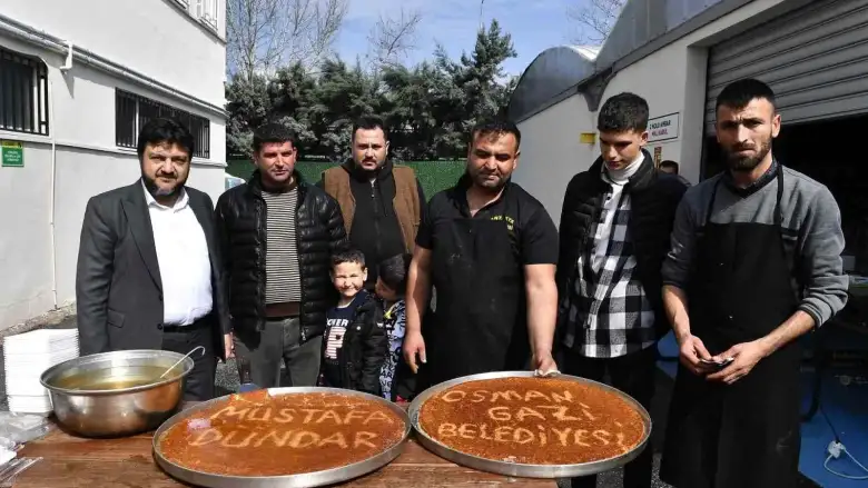 Osmangazi Belediyesinin Soğanlı Şantiye Birimlerinde ocağını kurarak üzerinde Mustafa Dündar ve Osmangazi Belediyesi yazan künefeleri pişiren Sipahi, deprem bölgesinde yürüttükleri özverili çalışmalardan dolayı belediye personeline teşekkürlerini sundu.