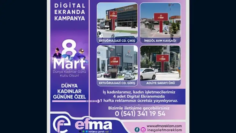 İnegöl'ün 3 noktasında 4 ekran ile hizmet veren Efma reklam 8 Mart dahil olmak üzere 1 hafta boyunca