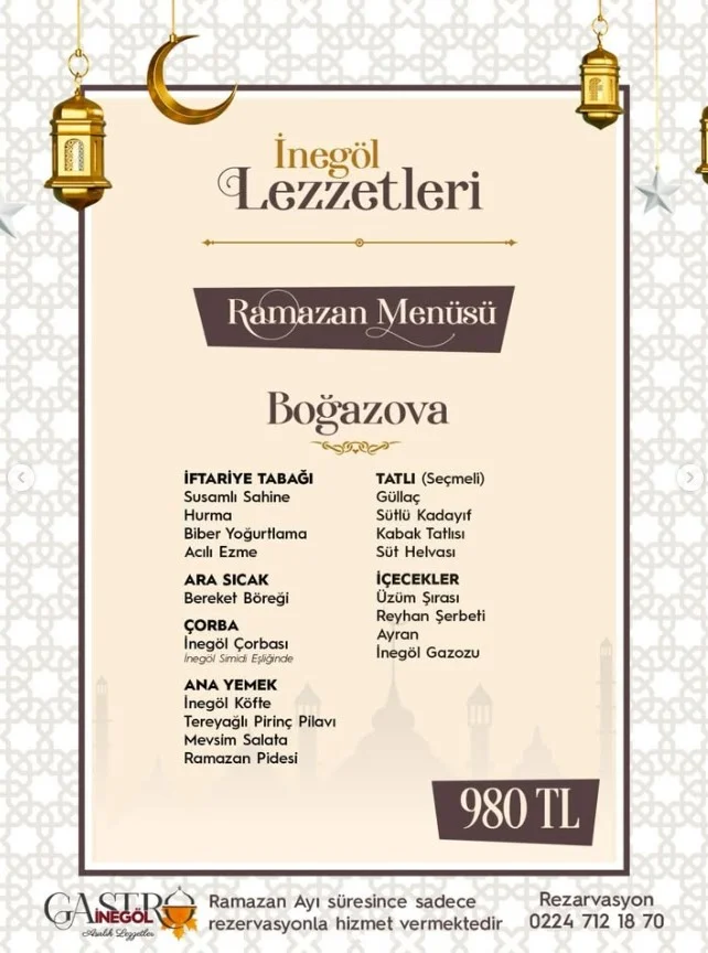 Gastro İnegöl tarafından açıklanan iftar menüleri şu şekilde: