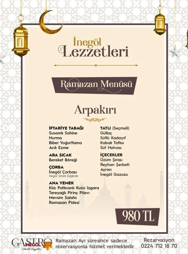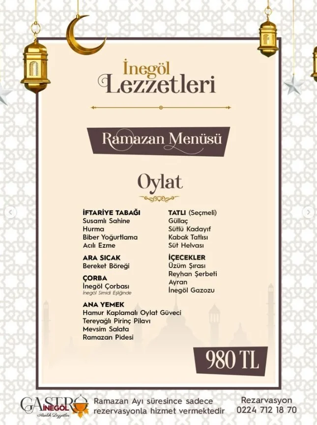 Ramazan ayının yaklaşmasıyla birlikte İnegöl’de iftar menüleri netleşmeye başladı. İlçede hizmet veren Gastro İnegöl, bu yıl Ramazan’a özel hazırladığı 7 farklı menüyü duyurdu. Menü isimleri İnegöl’ün doğa ve bölge adlarından seçilirken, fiyatlar 650 TL ile 980 TL arasında belirlendi.