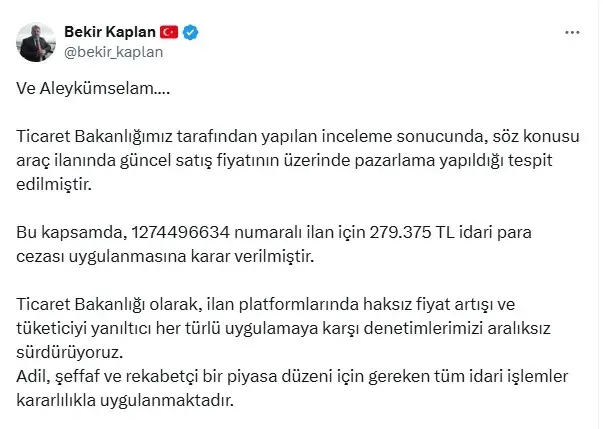 Ticaret Bakanı Basın Danışmanı Bekir Kaplan, cezayı duyurduğu sosyal medya paylaşımında şu ifadeleri kullandı:“Ve Aleykümselam... Ticaret Bakanlığımız tarafından yapılan inceleme sonucunda, söz konusu araç ilanında güncel satış fiyatının üzerinde pazarlama yapıldığı tespit edilmiştir.