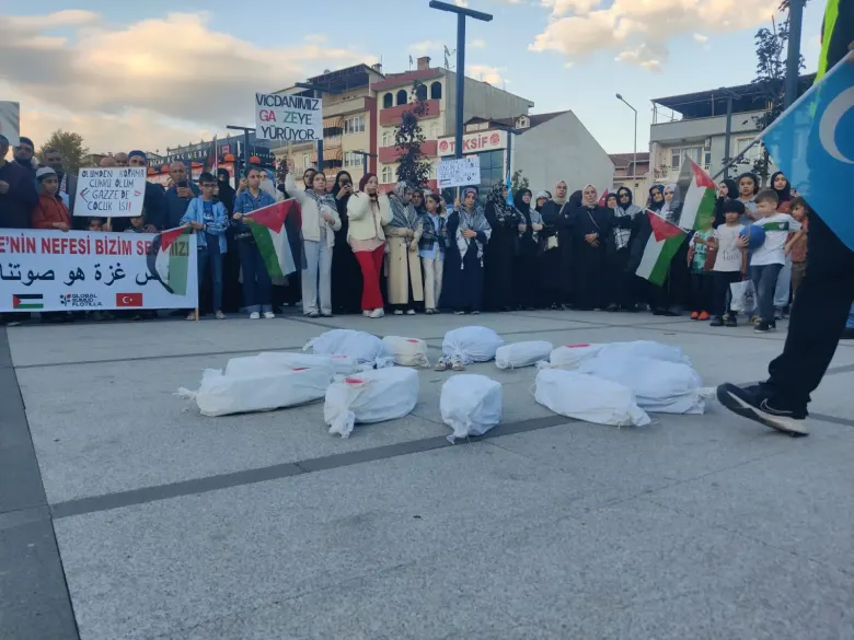 Etkinlikte, Gazze’de hayatını kaybeden çocukları temsilen beyaz kefenlerle sarılmış sembolik bedenler yere konuldu. Her kefenin yanına, o çocukların hayat hikayesini anlatan broşürler ve fotoğraflar bırakıldı.