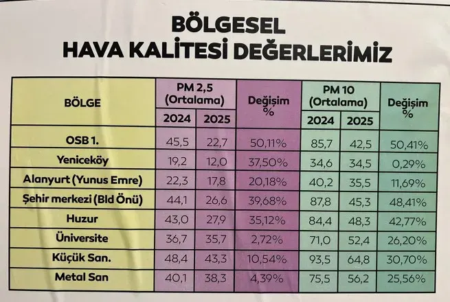 PM10 ölçümlerine göre en düşük kirlilik Yeniceköy (34.5 µg/m³) ve Alanyurt (35.5 µg/m³) bölgelerinde kaydedildi.