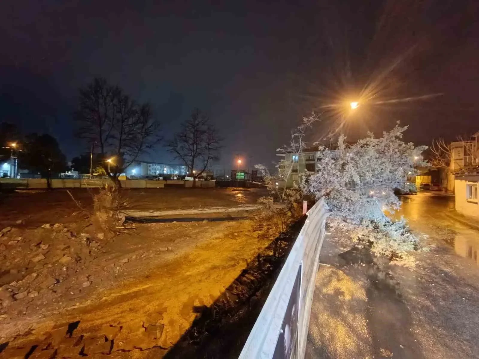 Bursa'nın İnegöl ilçesinde bir inşaat alanında bulunan ağaç, yağış ve rüzgarın etkisiyle kökünden çıkarak yola devrildi. Olay, saat 22.30 sıralarında Fatih Mahallesi Emniyet Sokak'ta meydana geldi.