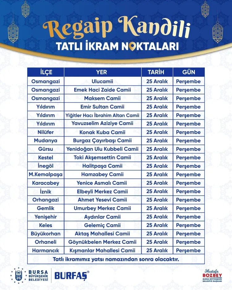 Bursa’nın İnegöl ilçesinde ise kandil gecesi ikram noktası netleşti. Buna göre, yatsı namazı sonrası Süleymaniye Mahallesi Bahçe Sokak üzerinde bulunan Halitpaşa Camisi’nde Bursa Büyükşehir Belediyesi tarafından tatlı ikramı yapılacak.