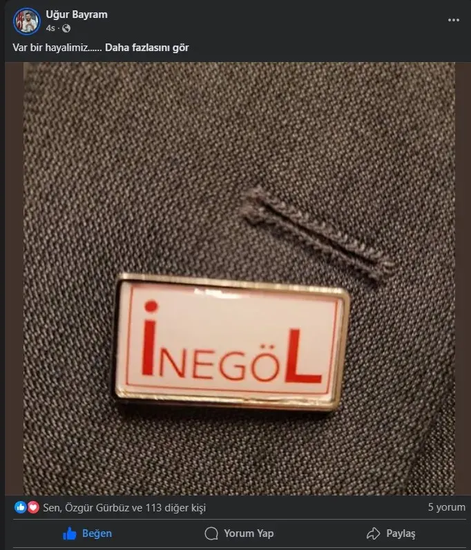 Bayram, paylaştığı İnegöl rozeti fotoğrafına “Var bir hayalimiz” notunu ekledi.