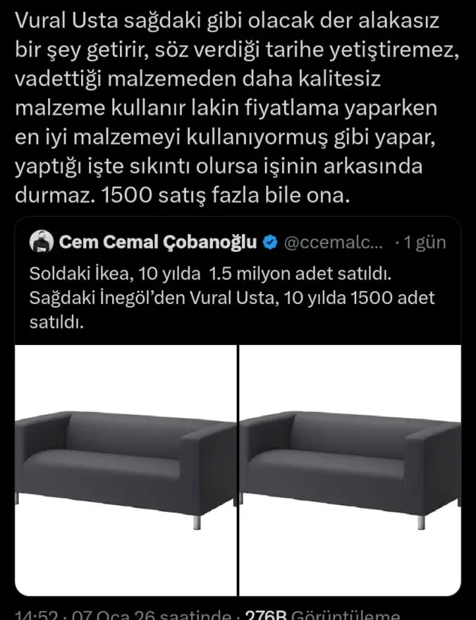 Paylaşımda ayrıca, iki benzer koltuk görseli yan yana konularak satış adetleri üzerinden bir karşılaştırma yapıldı. Uluslararası bir markanın 10 yılda milyonlarca satış yaptığı belirtilirken, İnegöl’den bir üreticinin aynı sürede çok daha düşük satış rakamlarına ulaştığı ifade edildi.