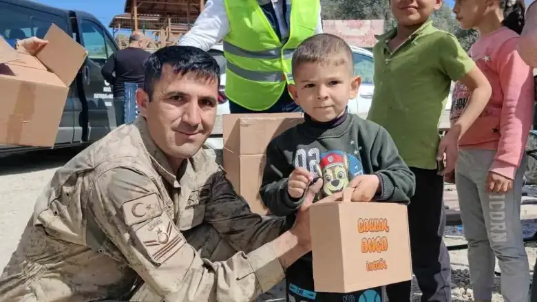 İnegölde hazırlanan 6 bin 500 koli Hatayın Antakya ilçesine götürülerek, kırsal mahallelerde askeri personel ile birlikte çocuklara dağıtıldı. Bakkal Amca yazılı kutuların içini açan çocuklar yaşanan acılara rağmen büyük sevinç yaşadılar. Kutulardan çıkan Türk bayrağını sallayarak, mutluluklarını gösterdiler.