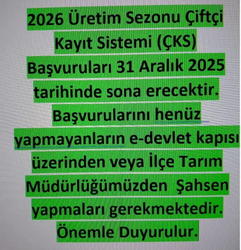 İnegöl İlçe Tarım ve Orman Müdürlüğü, 2026 üretim sezonu Çiftçi Kayıt Sistemi (ÇKS) başvuruları ile ilgili önemli bir duyuru yayımladı. Yapılan açıklamaya göre, ÇKS başvuruları 31 Aralık 2025 tarihinde sona erecek.
