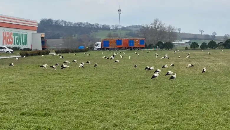 Hastavuk firmasının bahçesine inen leylekleri görenler gözlerine inanamadı. Firma yetkilileri soğuk havada karınlarını doyurabilmesi için leyleklere yem attı.