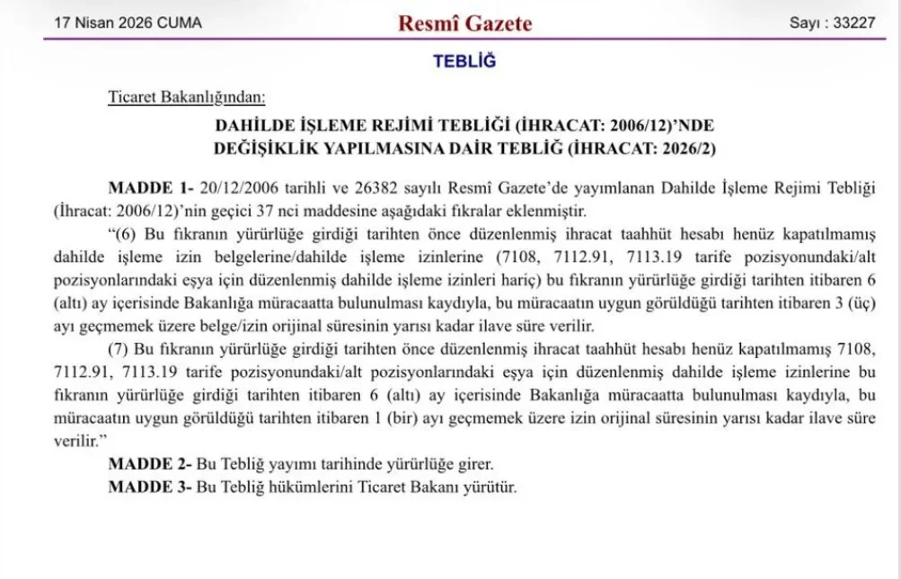 17 Nisan 2026 tarihli Resmi Gazete’de yayımlanan tebliğe göre, belirli tarihlerde düzenlenmiş ve henüz kapatılmamış dahilde işleme izin belgeleri için ek süre verilmesi kararlaştırıldı. Buna göre, başvuru yapılması ve uygun görülmesi halinde firmalara ilave süre tanınacak.