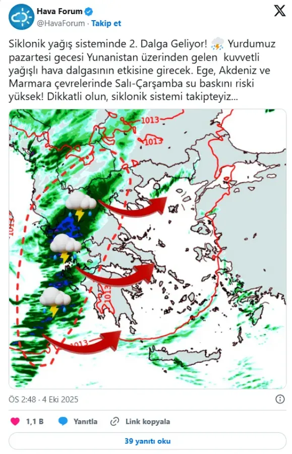 Meteoroloji Genel Müdürlüğü, yeni haftaya ilişkin önemli bir uyarı yayımladı. Yunanistan üzerinden gelen ‘siklon dalgası’ bu gece Türkiye’nin batı kesimlerinden giriş yapacak. Özellikle Bursa, Ege, Marmara ve Akdeniz bölgelerinde kuvvetli sağanak yağışların etkili olması bekleniyor.