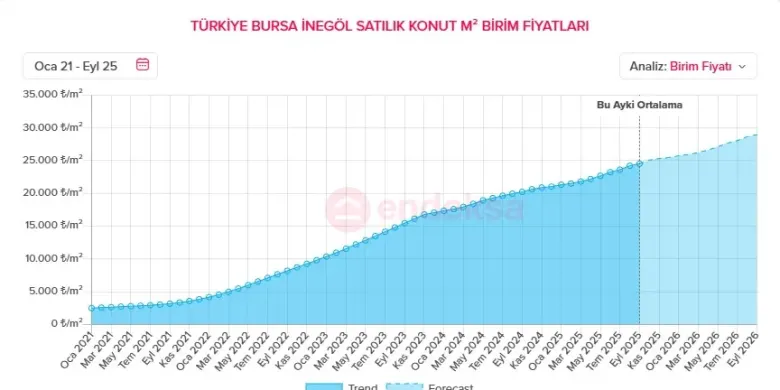 Endeksa.com verilerine göre, Ocak 2021 – Eylül 2025 döneminde İnegöl’de satılık konut m² birim fiyatı yüzde bin 43,52 oranında arttı.