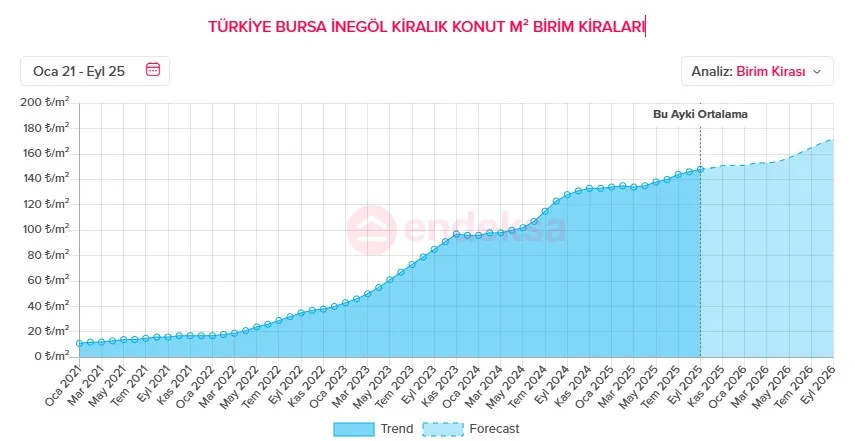 Gayrimenkul veri analiz platformu Endeksa’nın istatistiksel modelleme sonuçlarına göre, İnegöl’de konut fiyatlarında artış trendi önümüzdeki dönemde de sürecek.