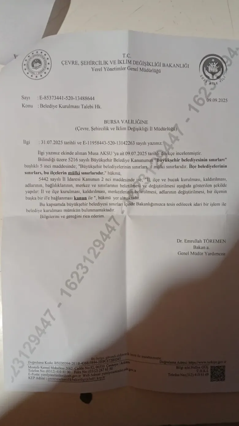 Ancak Bakanlıktan gelen yanıtta, 5216 sayılı Büyükşehir Belediye Kanunu ve 5442 sayılı İl İdaresi Kanunu gerekçe gösterilerek, idari işlemle yeni bir belediye kurulmasının mümkün olmadığı belirtildi.