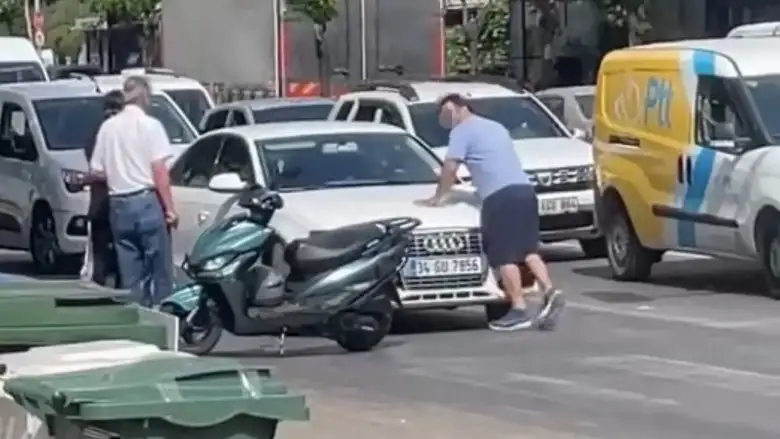 İddiaya göre, bir motosiklet sürücüsü ile otomobil sürücüsü arasında trafikte yol verme yüzünden tartışma çıktı. Tartışmanın büyümesi üzerine motosikletinden inen sürücü, otomobilin önünü kesti ve aracın sileceğini kırdı.